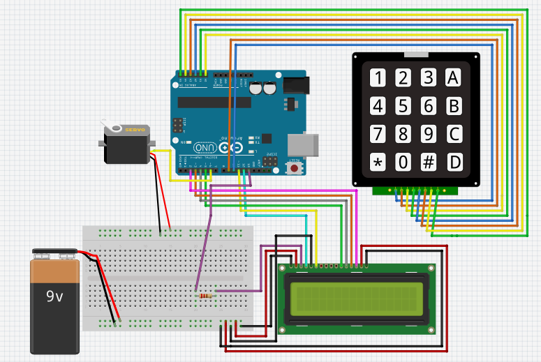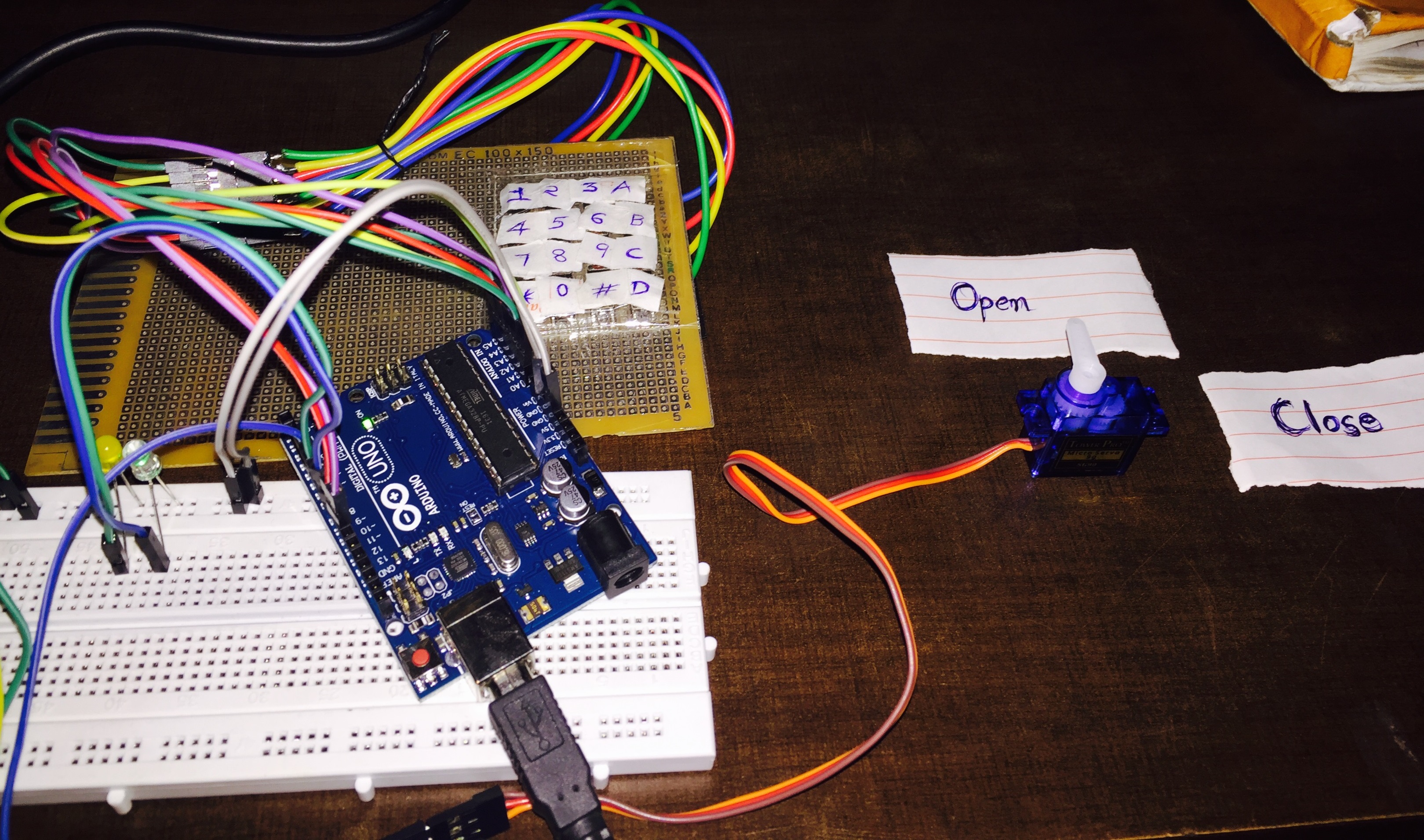 #include <Servo.h> #include <Keypad.h> Servo servo_Motor; char* password = "123AB"; int position = 0; const byte ROWS = 4; const byte COLS = 4; char keys[ROWS][COLS] = { {'1','2','3','A'}, {'4','5','6','B'}, {'7','8','9','C'}, {'*','0','#','D'} }; byte rowPins[ROWS] = {A2, A3, A4, A5}; //byte colPins[COLS] = {5, 4, 3, 2}; byte colPins[COLS] = {10, 9, A0, A1}; Keypad keypad = Keypad( makeKeymap(keys), rowPins, colPins, ROWS, COLS ); int redPin = 7; int greenPin =8; void setup() { Serial.begin(9600); delay(1000); pinMode(redPin, OUTPUT); pinMode(greenPin, OUTPUT); Serial.println("Door Lock System"); servo_Motor.attach(6); setLocked(true); } void loop() { char key = keypad.getKey(); if (key == '*' || key == '#') { position = 0; setLocked(true); } if (key == password[position]) { position ++; } if (position == 5) { setLocked(false); } delay(100); } void setLocked(int locked) { if (locked) { digitalWrite(redPin, HIGH); digitalWrite(greenPin, LOW); servo_Motor.write(0); Serial.println("Door closed"); delay(1000); } else { digitalWrite(redPin, LOW); digitalWrite(greenPin, HIGH); servo_Motor.write(90); Serial.println("Door Opened"); } }Some screenshots of implementation: