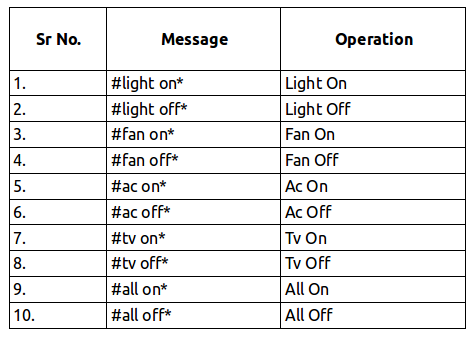 Here, there is list of messages which we send via SMS to turn appliances On and Off: